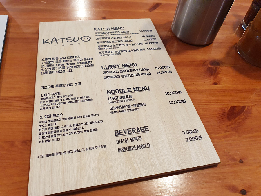 교대역에 일이 있어 갔다가 가츠오에서 저녁을 먹고 가기로 했습니다. 교대역에서 꽤 오래된 돈가츠 맛집이라고 하더라고요. 저는 이번에 첫 방문했습니다. 저녁은 오후 5시부터 시작됩니다. 여기는 특이하게 쿠로고마 안심흑가츠라는 메뉴가 있더라고요. 직접 숙성해서 사용하는 빵가루가 너무 맛있는 집이라고 소개해주시더라고요. 그리고 니꾸고보텐 우동도 판매하던데요. 한국에서 우엉튀김이 들어간 우동은 잘 보지 못해서 다음엔 이 메뉴로 먹어보려고 합니다.