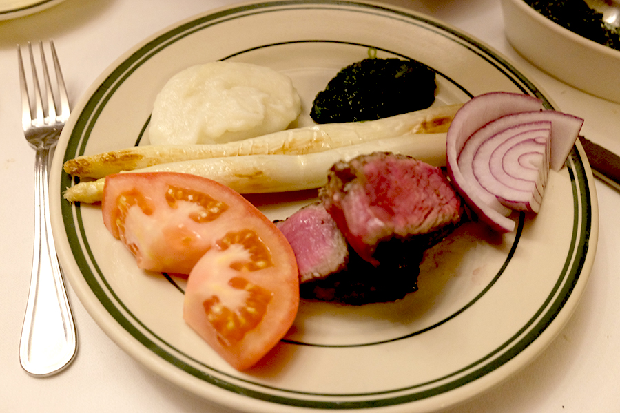조금 뒤 나온 메인 스테이크. 매쉬드 포테이토, 크림 스피나치, 어니언&토마토, 화이트 아스파라거스까지 함께 나오니 굉장히 푸짐해 보입니다.