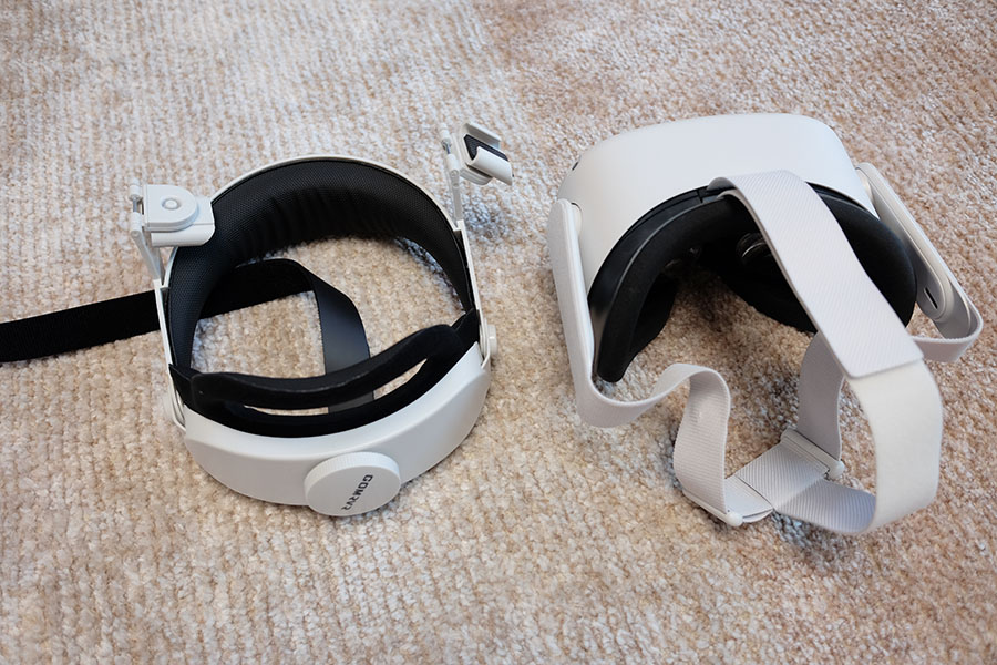 왼쪽이 헤일로 스트랩. 오른쪽은 오큘러스 퀘스트 2입니다. 오큘러스 기기의 회색 띠를 먼저 제거해줍니다.