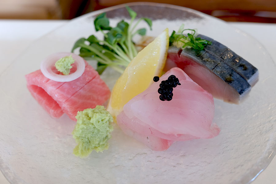 사시미로는 광어에 캐비어를 살짝 올려주셨고 참치도로, 고등어 초절임이 나옵니다. 고등어는 산패가 빠른 편인데 역시 제주에서 먹는 고등어회는 비린 맛이 거의 없고 깨끗한 느낌이네요.