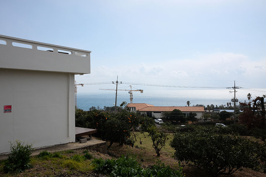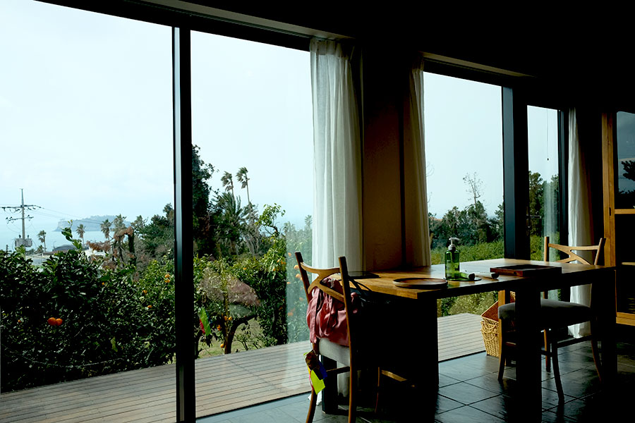 등 뒤로는 통창이라 제주 바다와 한라봉 나무가 예쁘게 어우러져 있는 걸 볼 수 있습니다.