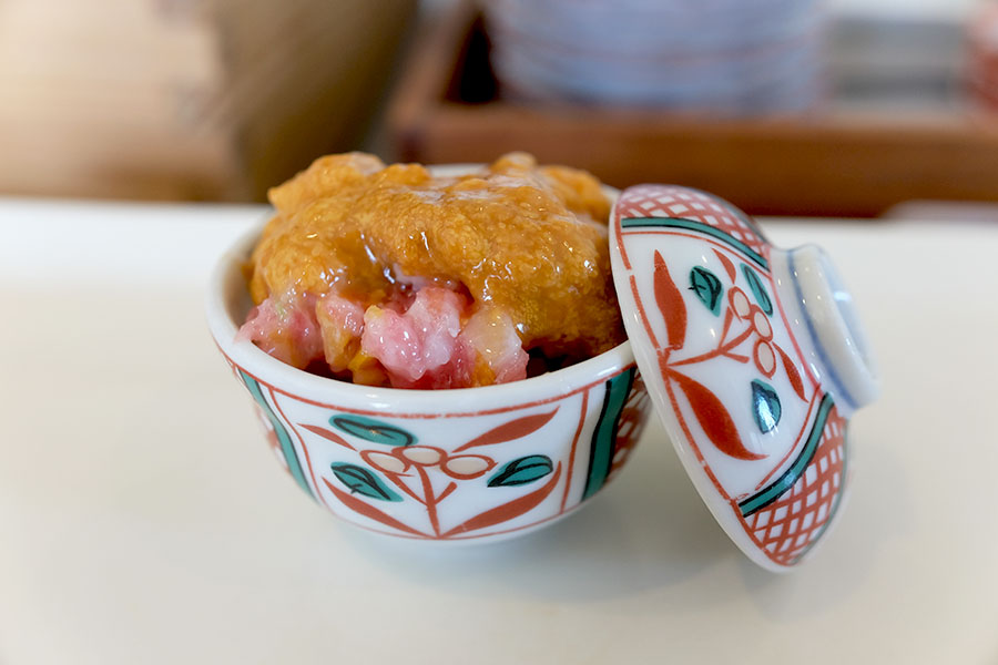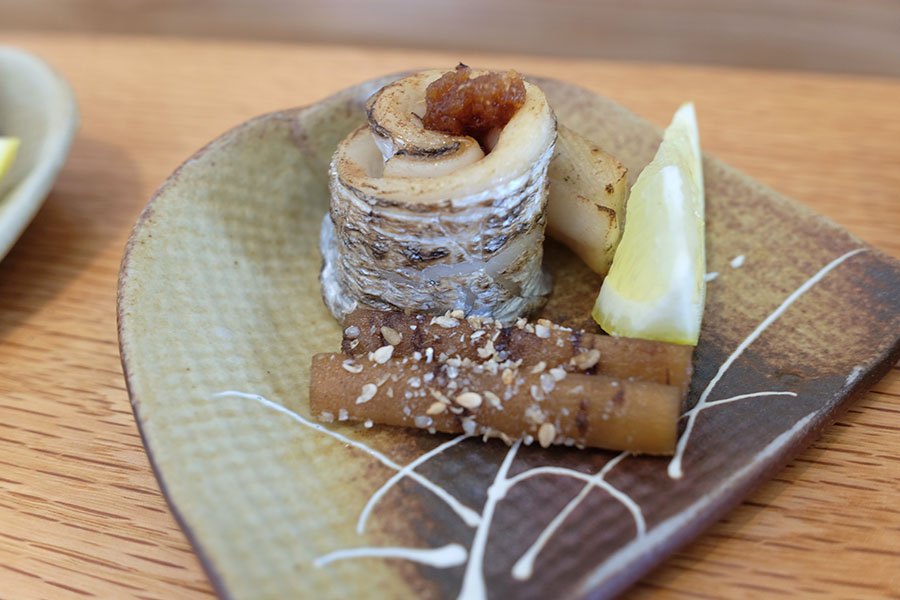 제주산 아나고. 원래 아나고는 온도를 따뜻하게 해야 가시가 있어도 부드럽다고 하셨는데요. 일본의 엄청 유명한 일식당인 지로에서는 데우지 않는다고 하시더라고요. 좋은 아나고는 굳이 데우지 않아도 가시마저 부드럽다고 들은 경험담을 말해주셨어요. 제주산 아나고도 일본에서 경험한 그런 정도는 아니지만 충분히 부드럽다며 이렇게 내어주신다고 설명해주십니다.