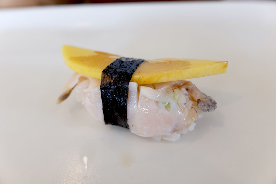 애플망고 전복 스시. 생전복이라 오돌도돌한 맛에 달달한 망고가 더해지니 좋더라고요.