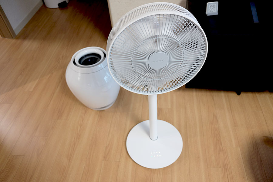 조립 완성. 발뮤다 21년형 그린팬s 화이트 그레이. 정말 깔끔하고 이뻐요. 뒤에는 겨울부터 지금까지도 잘 쓰고 있는 발뮤다 가습기. 발뮤다는 가습기를 구입하면서 제품력에 대해 신뢰가 생겼어요. 덕분에 그린팬s도 믿고 구입했는데 정말 만족하고 있습니다.