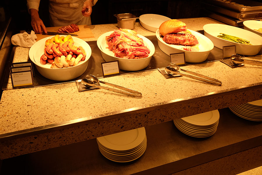 소시지, 베이컨, 구운 아스파라거스 등이 보이네요.