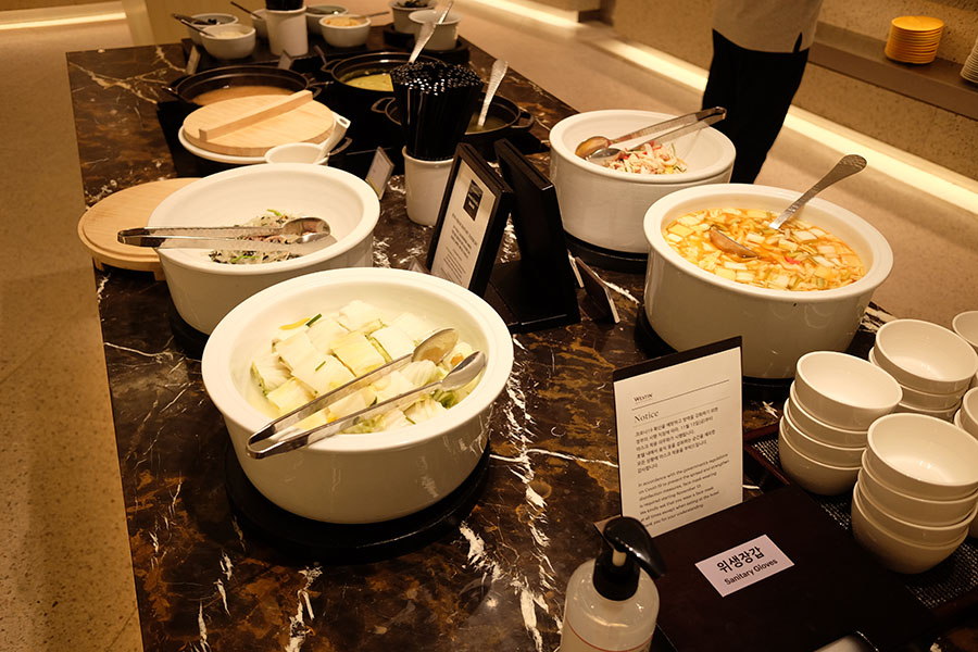 한식 코너로 가봅니다. 음식 테이블 옆에 위생 장갑과 손소독제가 비치되어 있어요. 특히 음식 담을 때는 꼭 위생장갑을 사용하여야 합니다.