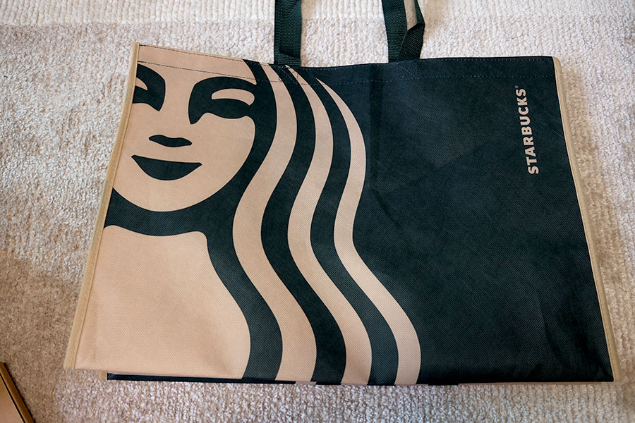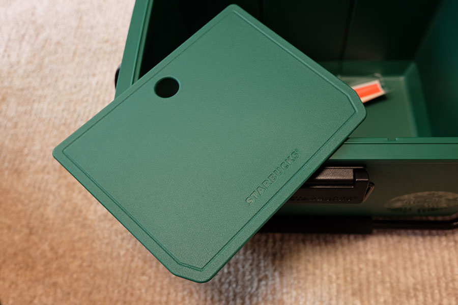 상단에도 스타벅스 문구가 음각으로 새겨져 있습니다. 크기는 385 X 232 X 254 mm. 내부 용량은 약 11L가 된다고 해요.