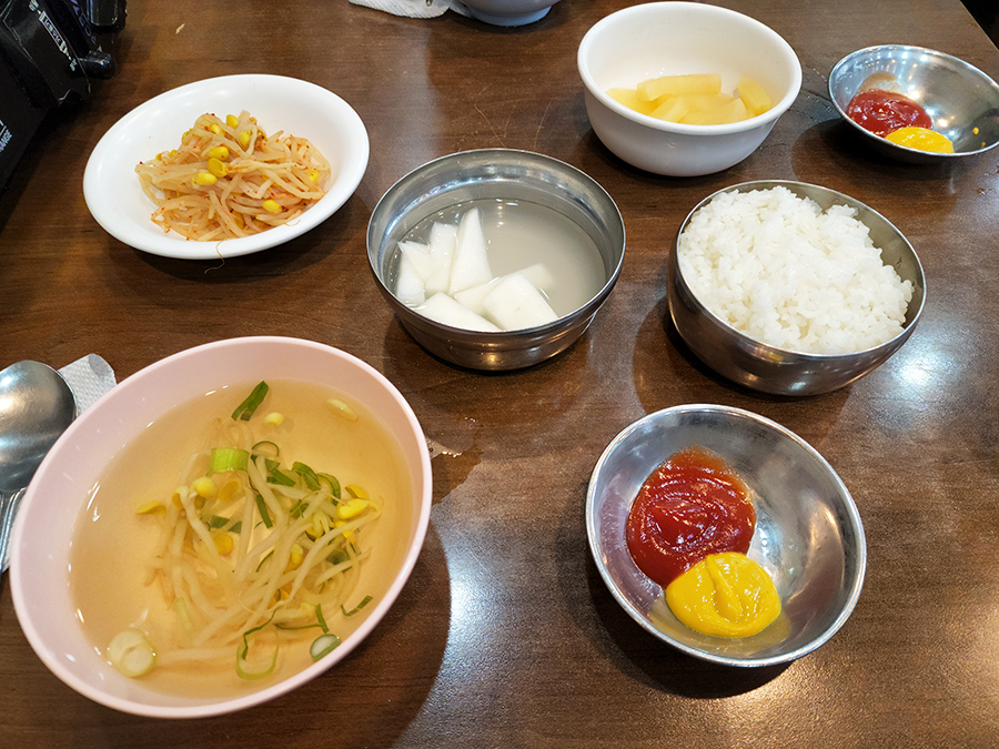 주문 후 나오는 기본 반찬. 쏘세지를 주문해서 케첩과 머스타드 소스가 나왔습니다.