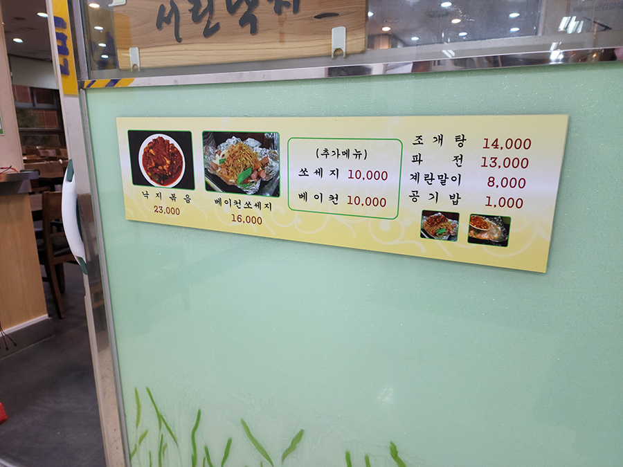 간단한 메뉴판. 낙지볶음과 베이컨 쏘세지 하나씩 주문하면 보통 2인이 먹기에 딱 알맞습니다.