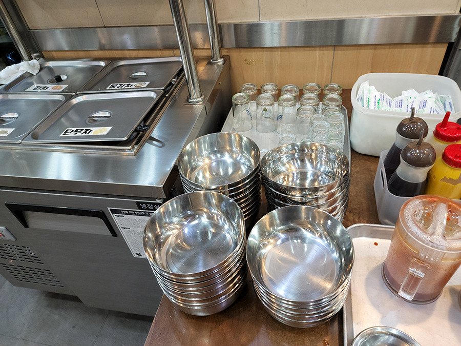 참기름과 추가 소스, 밑반찬은 카운터 옆에 배치되어 있습니다. 비벼먹기 좋은 큰 그릇도 있으니 가져다 쓰시면 됩니다. 김이 없는 게 살짝 아쉽네요.