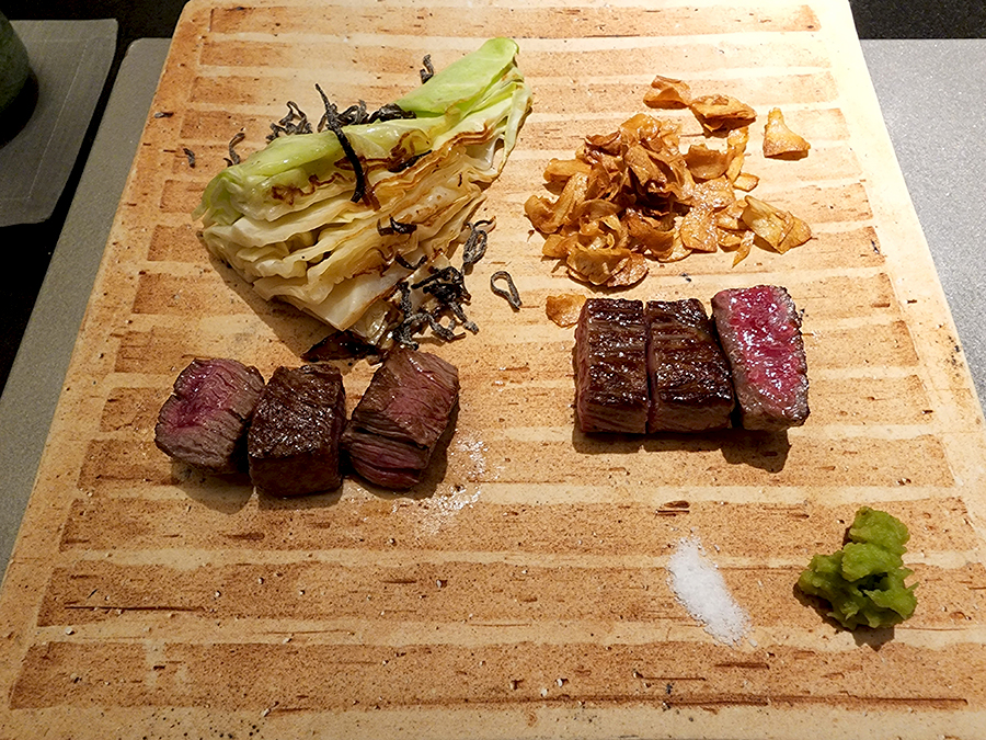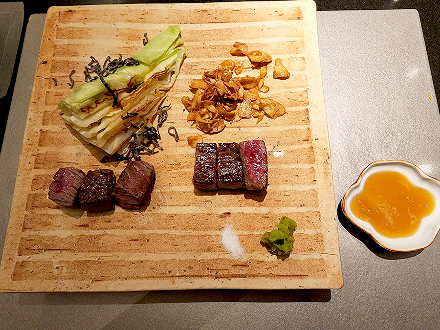 왼쪽이 안심 오른쪽이 등심이었던 거 같은데 사진으로 보니 헷갈리네요. 구운 마늘과 양배추 위에 다시마 젤리를 함께 올려주십니다.