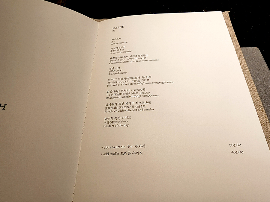 중식 코스 메뉴를 위와 같고 안심으로 하나 변경하였고 우니를 추가했습니다. 그리고 원래 디너 코스에 활전복이 나오는데 전복도 하나 따로 추가했습니다. 전복은 싯가라고 하셨는데 얼마인지 기억이 안 나네요.