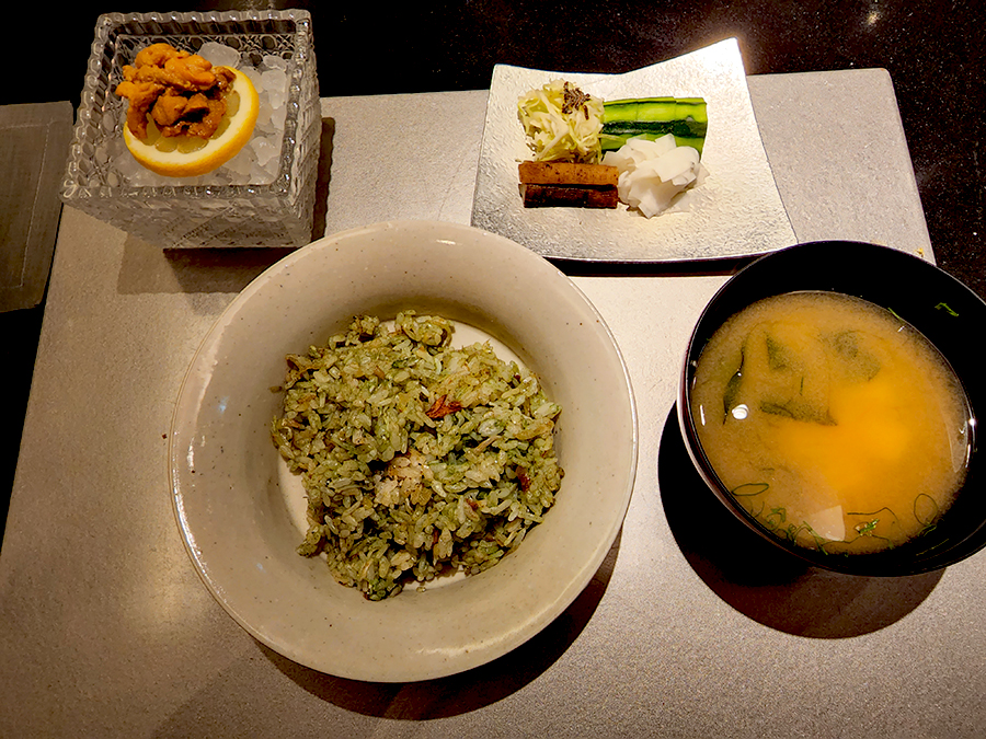 마지막 디쉬는 시라스 산초 볶음밥. 시라스는 일본 잔멸치 같은 거고 산초는 다들 아시는 추어탕에 넣어먹는 그 산초입니다. 산초로 만든 소스를 넣고 볶아 줍니다. 개인적으로 산초를 너무 좋아해서 그런지 이 볶음밥이 정말 맛있었습니다. 배가 엄청 불렀는데도 다 먹게 만든 마성의 볶음밥.