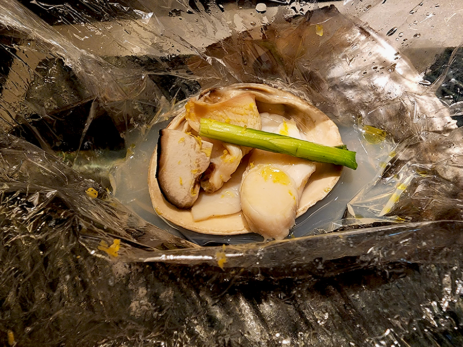 사키즈케. 얇은 유리로 만든 봉지에 모시조개, 북방 조개 등을 넣고 한번 끓여서 내어 주십니다.