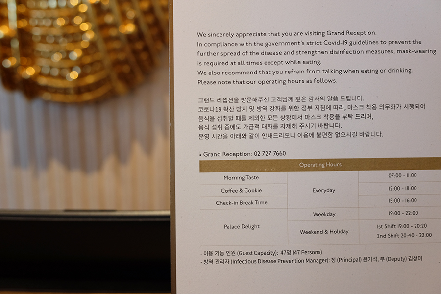 웰컴 티를 마시며 앉아 있으니 남편이 체크인을 마치고 자리에 왔습니다. 그랜드 리셉션 운영 시간은 위와 같습니다. 평일에는 3시부터 4시까지 체크인을 위한 브레이크 타임이 있습니다. 그 외에는 운영 시간 참고하여 다과를 즐기러 오면 되는데 횟수 무제한이라 좋습니다.