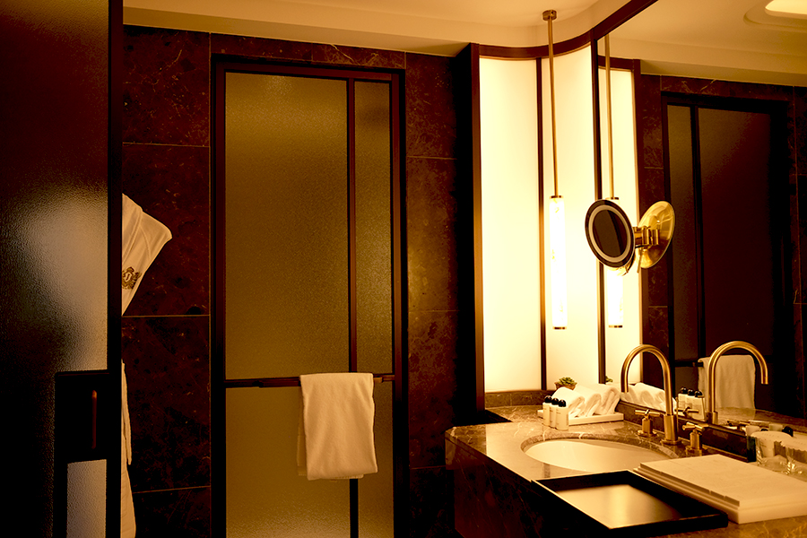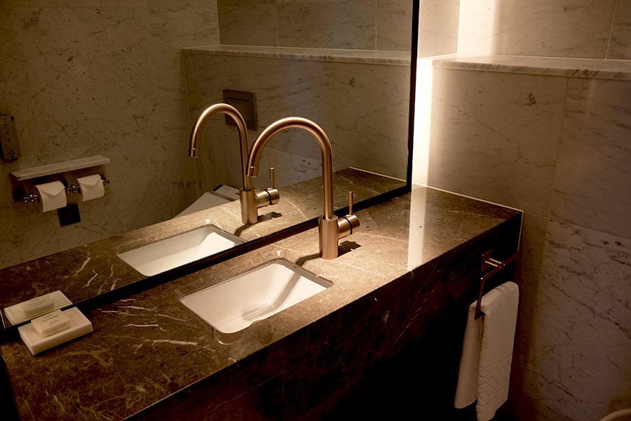 욕실 공간이 널찍해서 참 좋습니다. 오른편엔 욕조가 있고 왼편에 엄청 큰 샤워룸이 있습니다. 세면대 아래는 수건과 다이슨 헤어드라이기가 놓여 있습니다.