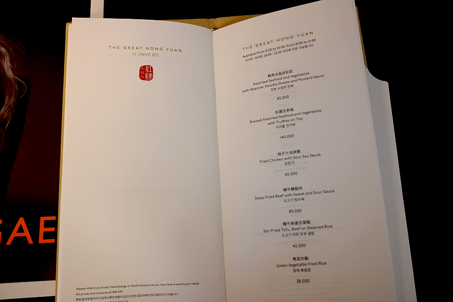 패드로 주문해도 되고 이렇게 룸서비스 메뉴 책을 보고 전화로 주문해도 됩니다. 홍연 소고기 탕수육은 조금 가격이 올라 89,000원입니다. 홍연에서 먹으면 9만원대로 알고 있습니다.