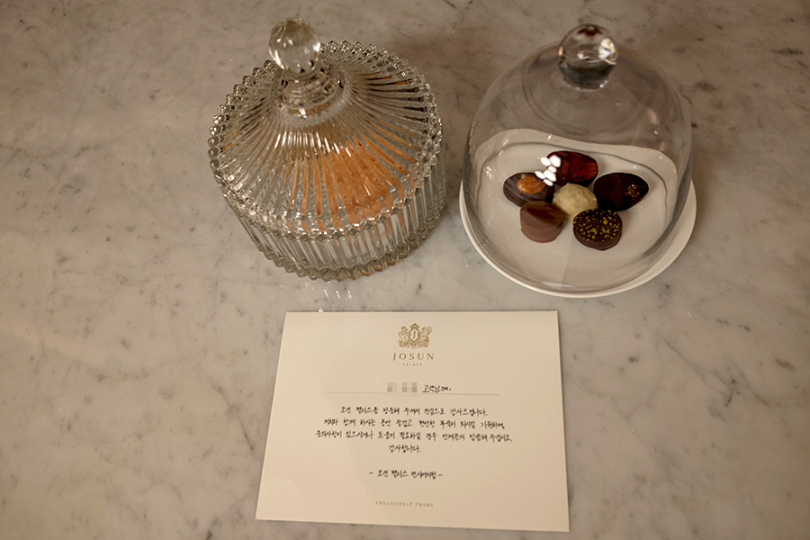 수영을 다녀오니 레터와 웰컴 스낵으로 초콜릿과 함께 천포 대신 선택한 다쿠아즈가 도착해있었습니다.