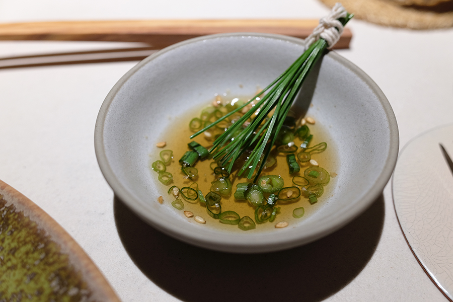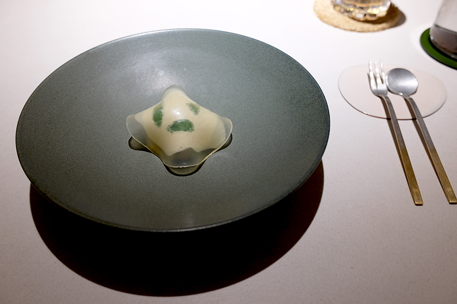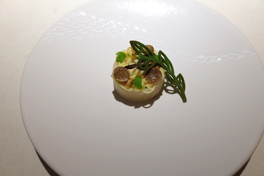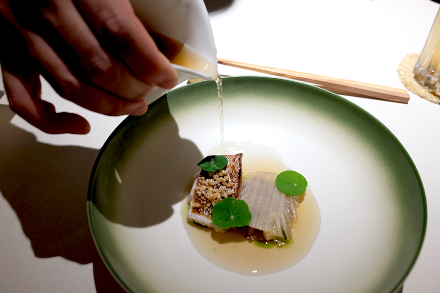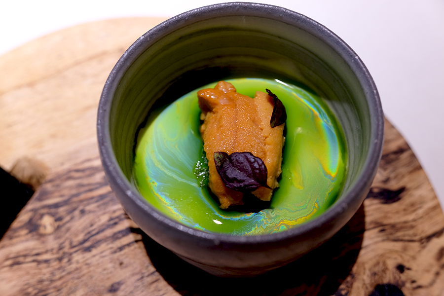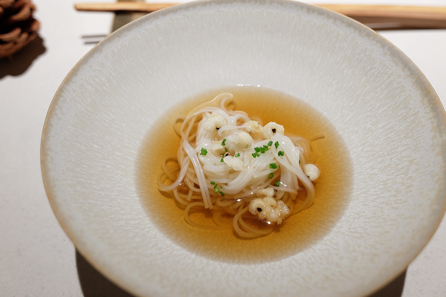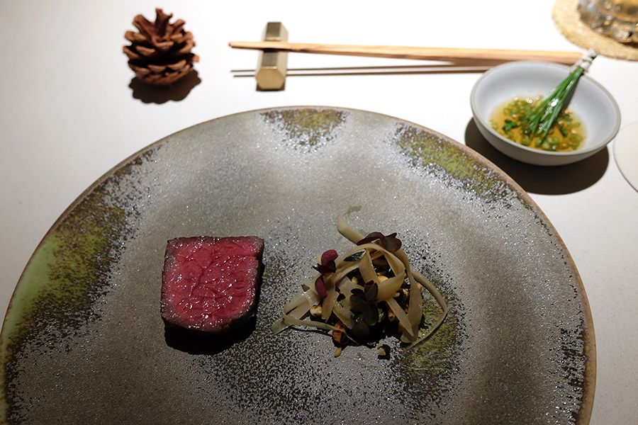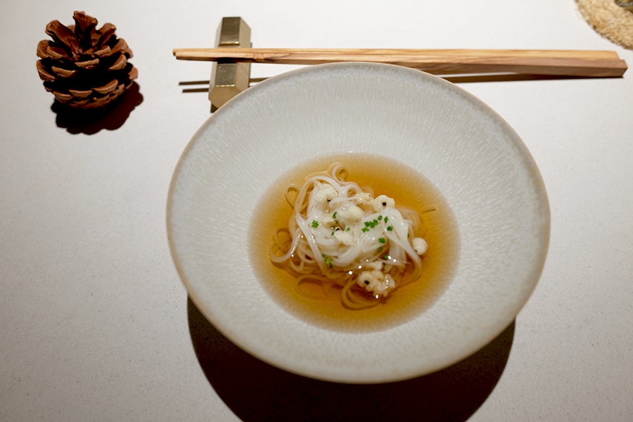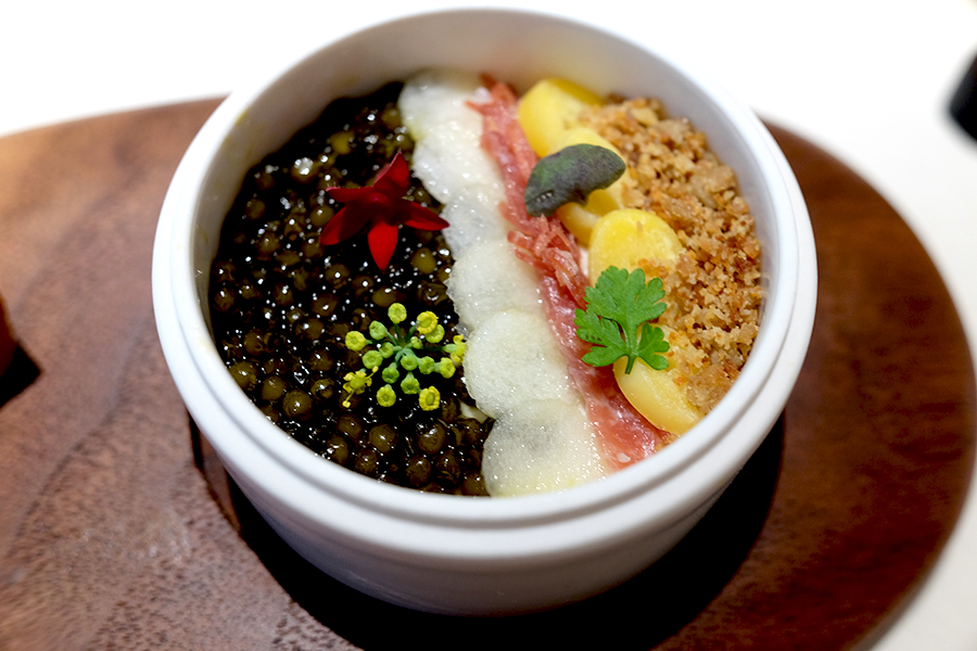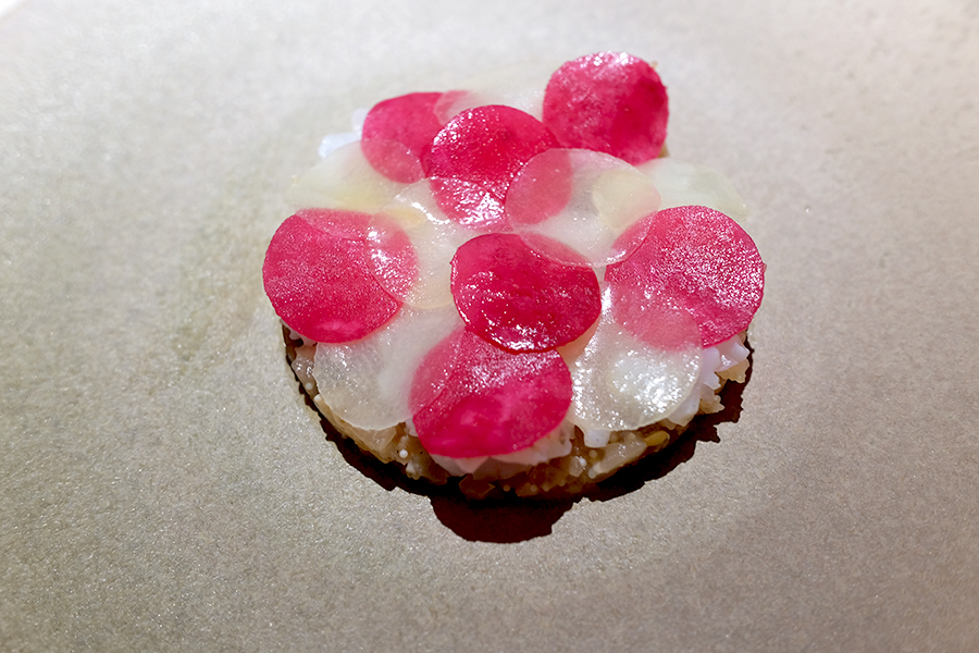 스모키하게 훈연한 한치와 청어알, 청어알 젓을 섞은 요리. 그 위에 예쁘게 무와 비트가 데코 되어 있습니다. 아래부터 위까지 스푼으로 떠서 먹으면 되는데 감칠맛이 정말 끝내주더라고요. 국물 요리가 아닌데 마치 나가사키 짬뽕을 먹는 듯한 그런 느낌이었습니다.