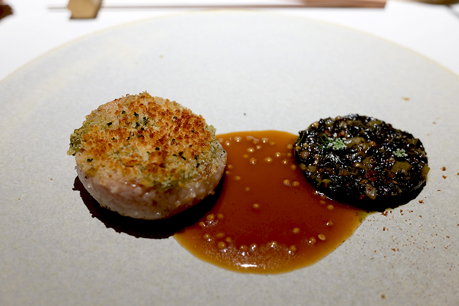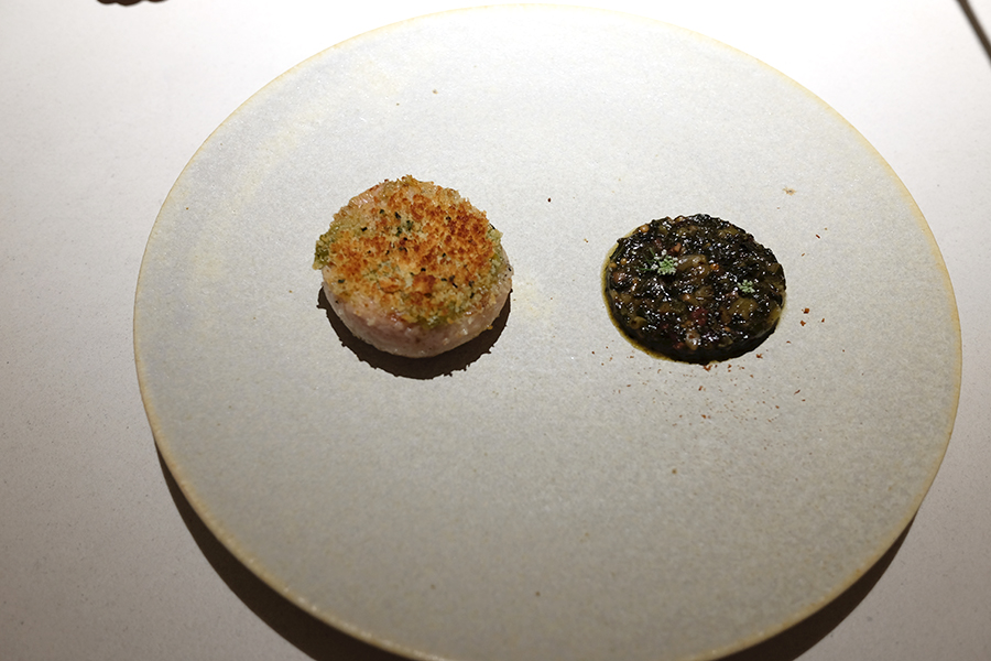 동그랑땡 같은 비주얼의 항정살에 갓김치를 다져 만든 가니쉬와 돼지뼈와 마스터드 씨앗으로 만든 소스를 함께 곁들여 먹으면 됩니다. 항정살이 느끼해서 별로 좋아하지 않는데 이건 느끼하지 않고 탱글탱글한 식감이 좋았습니다.