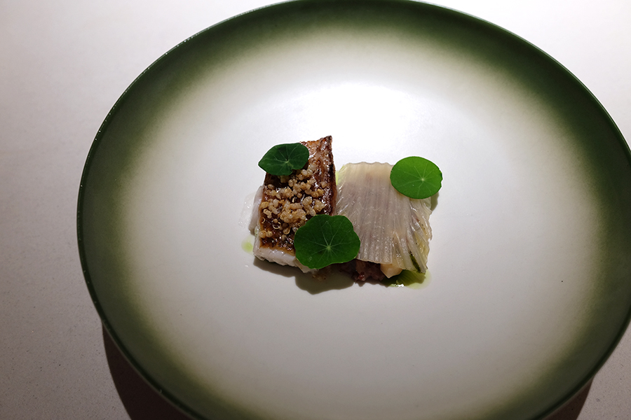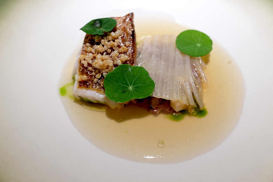 금태 위쪽으로는 바삭한 퀴노아 튀김이 올려져 더 바삭한 식감을 살려주었고요. 오른편에 있는 가니쉬는 배춧잎 아래 고대미와 다진 전복으로 채워져 있었습니다. 전복이 너무 잘게 다져 있어 살짝 아쉬웠지만 바삭한 금태와 함께 모두 곁들여 먹으니 깔끔하고 맛있었습니다. 금태는 일식집에서도 자주 접해서 좋아하는 식재료인데 역시나 이렇게 먹어도 맛있네요.