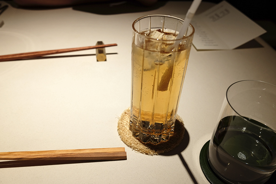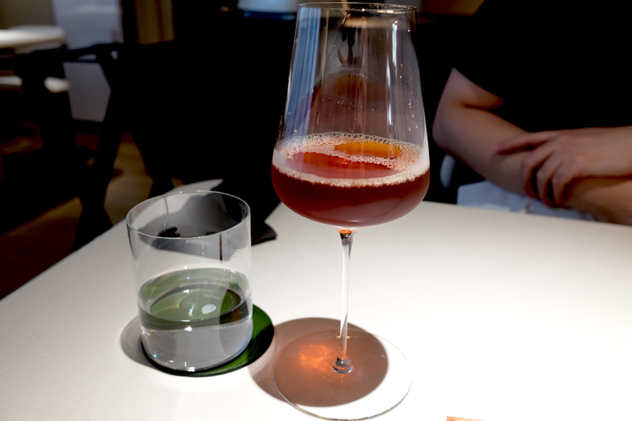 색 조합을 보고 비비면 좀 비쥬얼이 별로일꺼라 생각했는데 역시나 아쉬운 비쥬얼. 그래도 김부각이 두께감이 있어 좋았고 다소 느끼할 수 있는 걸 시소 기름이 잘 잡아주는 느낌이었습니다. 다만, 크림치즈 베이스의 디쉬를 두 번 연달아 먹으니 조금 느끼해지더라고요. 먹으면서 뭔가 앞과 이번 디쉬는 와인을 당기게 만든다는 느낌이었습니다. 아마 와인과 곁들여 먹으면 좀 더 맛이 풍부해지지 않았을까 합니다. 전 와인을 마실 수 없으니 이쯤 해서 진저에일 하나 부탁드렸습니다.