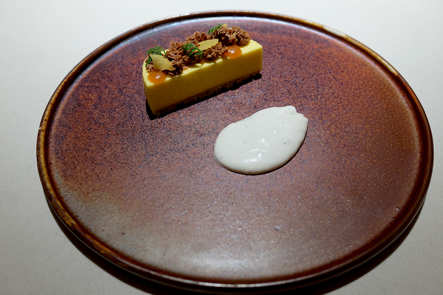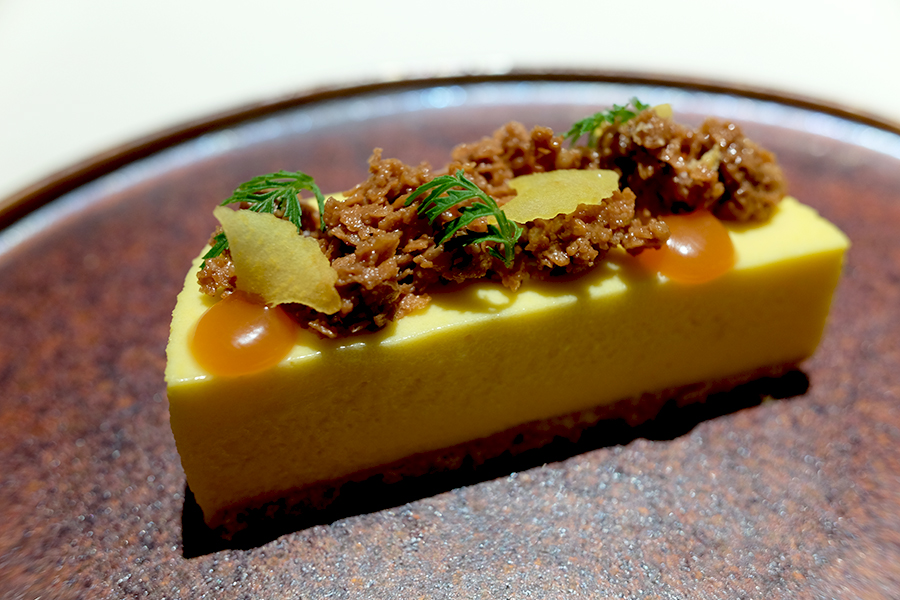 가까이 보면 더 예쁜 단호박 무스 케이크. 부드러운 단호박 무스에 프랄린이 올려져 있어 식감과 달콤한 맛을 더했고요. 옆에 있는 건 트러플 소스인데 함께 곁들여 먹으면 좀 더 고급스러운 디저트가 되더라고요.