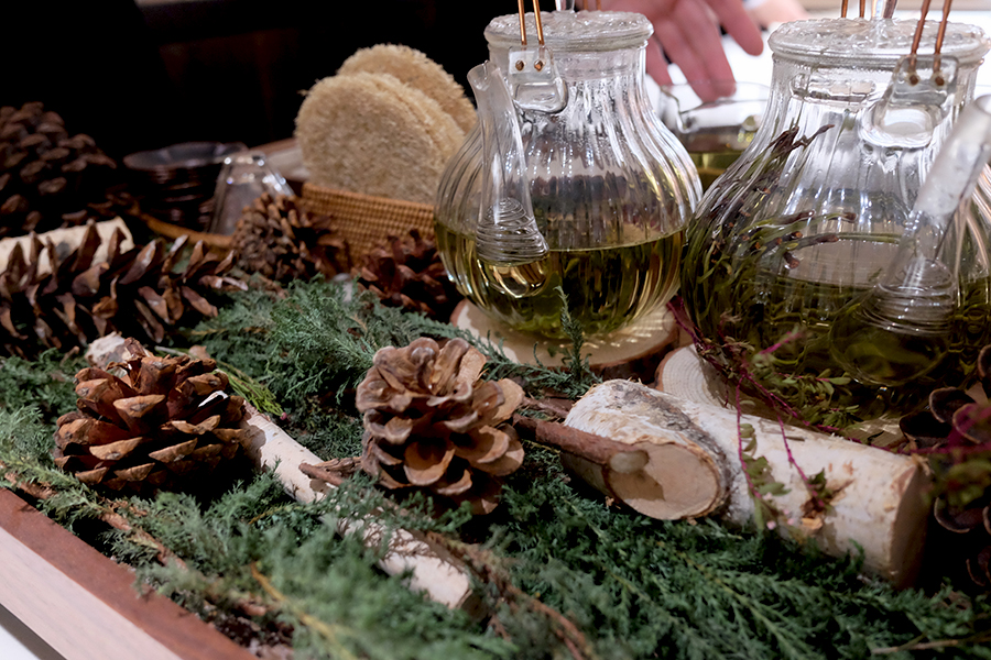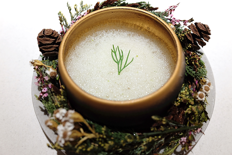 메인 디쉬들이 나오기 전 나온 클렌저로 상큼하고 개운한 느낌이었습니다. 솔밤으로 만든 화관이 너무 예뻐서 가져가고 싶더라고요. 진짜 솔밤 플레이팅은 하나하나 너무 예술입니다.
