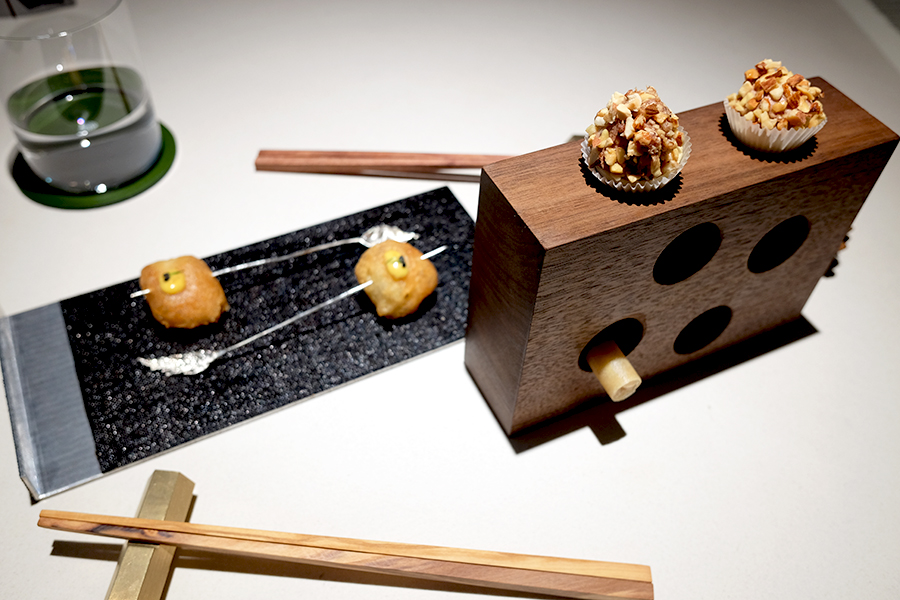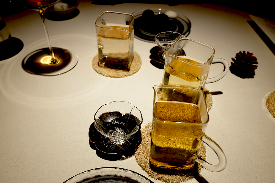 우엉으로 낸 육수와 튀밥이 목화솜처럼 올려져 있어 이 요리도 참 한국스럽다고 생각이 들었습니다. 솔밤 젓가락은 이 디쉬에서 사용하면 됩니다.