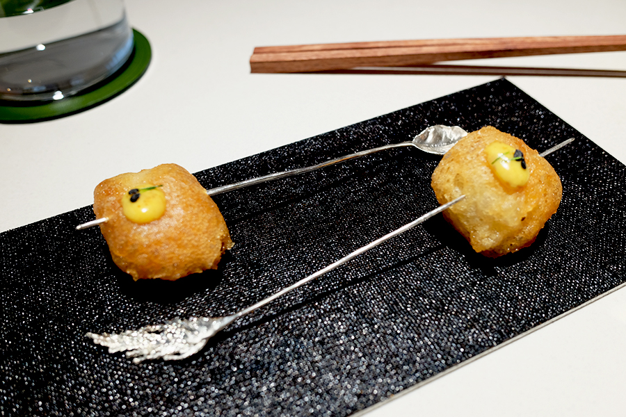 첫 번째 아뮤즈 부쉬. 관자, 전어, 닭간.