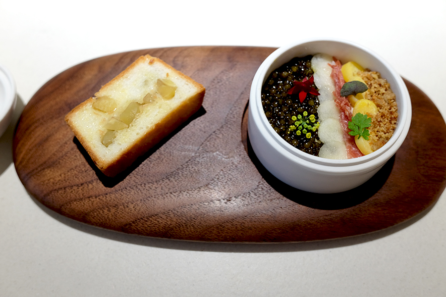 밤식빵과 함께 곁들여 먹을 크림치즈 베이스의 디쉬가 나왔습니다. 크림치즈 위에 캐비어, 무, 하몽 등이 예쁘게 올려져 있었습니다.