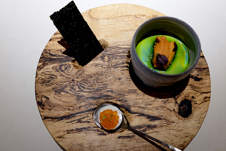 제 디쉬는 참치 대신 관자로 바꿔주셨습니다. 개인적으론 관자로 바뀌어서 더 맛있게 먹었던 거 같습니다. 메추리알 위에는 훈연한 송어 알이 올려져 있었고요. 북해도 우니 디쉬에는 역시나 크림치즈에 시소 기름으로 마무리되어 있었습니다. 메추리알을 그릇에 넣고 꼼꼼히 잘 비벼서 김부각과 함께 먹으라고 하시더라고요.