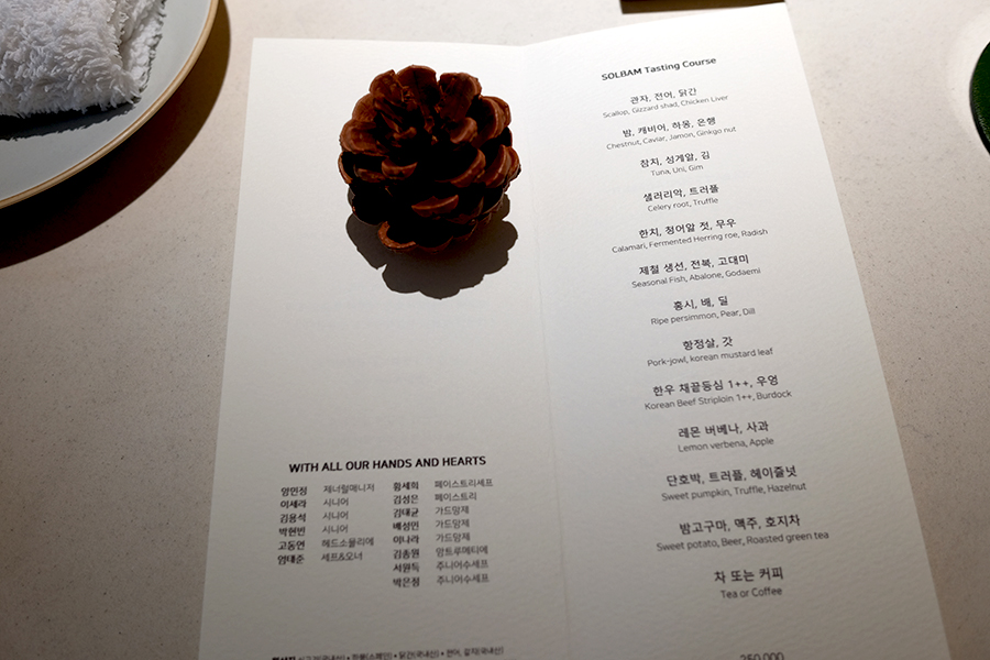 테이블에 앉으면 오늘 먹은 코스 요리 메뉴판이 이렇게 예쁜 솔방울과 함께 놓여져 있습니다.