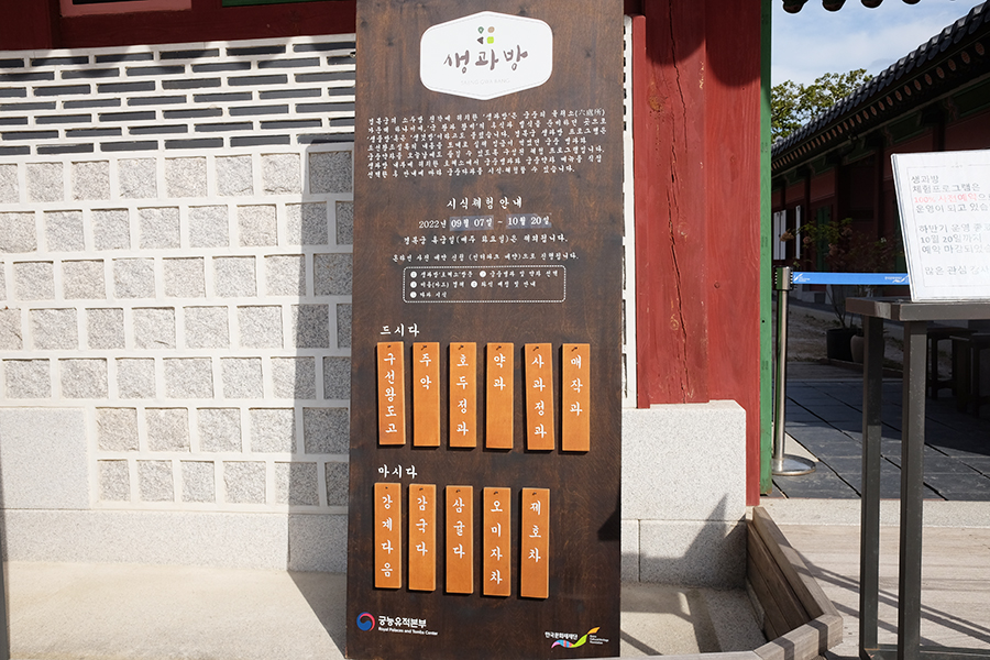 생과방 앞에는 시식 체험 안내판이 붙어 있습니다. 내부도 너무 예쁘고 경복궁 내에 맛있는 다과와 차를 내어주는 곳이다 보니 관광객분들이 지나가며 정말 많이 부러워하시더라고요.