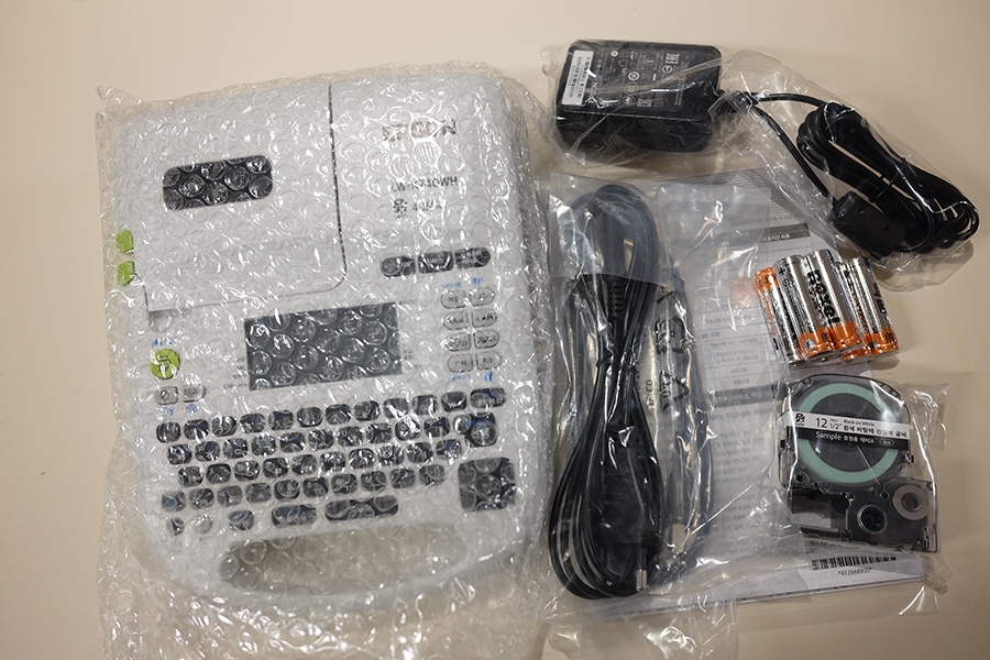 본품, 건전지, 라벨 테이프 1개, 전원 어댑터, usb 케이블 등이 동봉되어 있습니다.