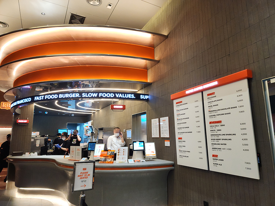 저녁 6시가 좀 넘어 도착했는데 다행히 앞에 8분정도 계셨습니다. 직원분께서 미리 메뉴판을 보여주시고 순서가 되면 키오스크로 안내해주십니다. 키오스크가 2대 있던데 무슨 일인지는 모르겠으나 한대만 운영하고 있었습니다. 주문은 꽤 빨랐는데 슈퍼 두퍼가 조리 기본 시간이 약 30분 정도 걸려서 주문 후 시간이 좀 더 걸렸던 거 같네요.