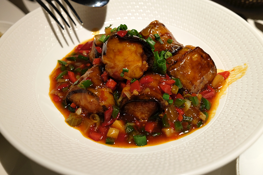 룸 서비스로 시켜먹었던 소고기 탕수육이 너무 맛있어서 이번에도 주문. 가격은 룸서비스보다 조금 더 비싼 97,000원입니다. 그 밖에 맛있다고 얘기 들어서 먹고 싶었던 다진 새우로 속을 채운 소양 가지도 함께 주문하였고요 가격은 55,000원입니다.