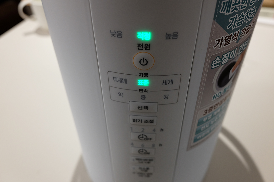 전원 켜주고 가습 모드 설정하면 끝. 저는 보통 부드럽게나 표준 모드로 사용하고 있습니다. 낮음, 적정, 높음은 현재 가습 상태를 표시해주는 건데 낮음이 35% 이하 구간이고 적정이 35~60% 구간 정도 되는 걸로 알고 있습니다.