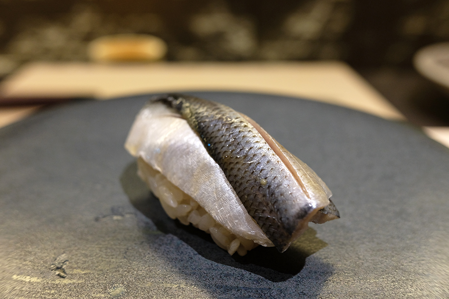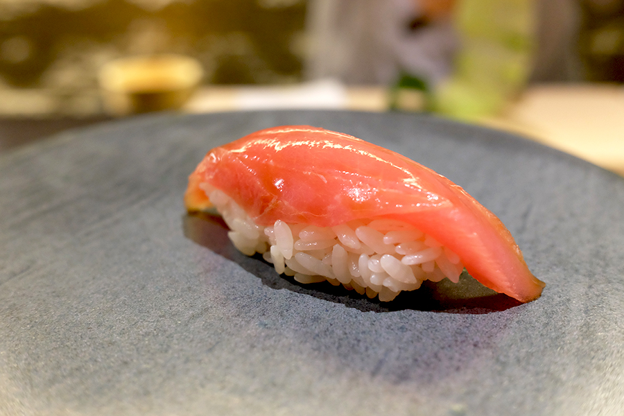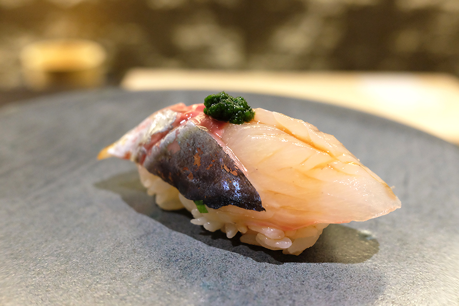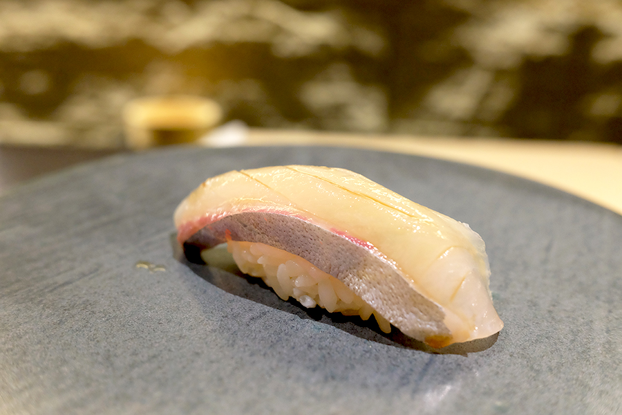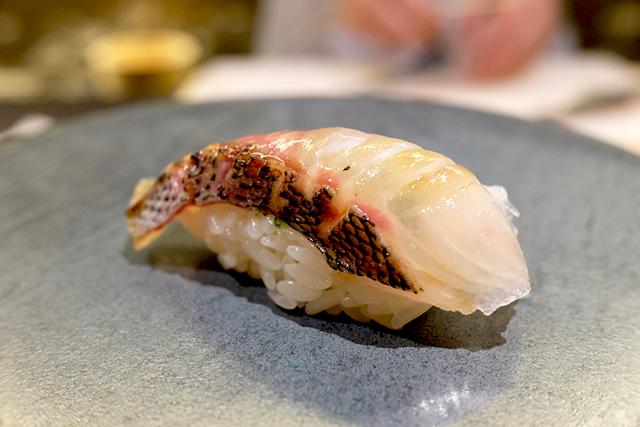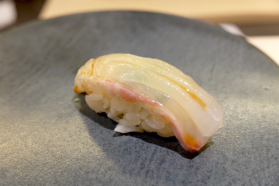 스시 첫 점은 참돔으로 시작합니다. 밥 양이나 네타 크기 모양 다 좋은데 살짝 샤리가 짜단 느낌이 들더라고요. 초보다 소금 간을 더 강하게 하시는 건지 모르겠지만 스시야 다니면서 샤리가 짜단 느낌은 이 날 처음 받았거든요. 산모식에 익숙해져서 그런 건지 잠깐 헷갈렸는데 제 생각엔 그냥 좀 짠 거 같습니다. 샤리 수분감, 온도 다 괜찮은데 다소 짠 느낌이 아쉬웠습니다.
