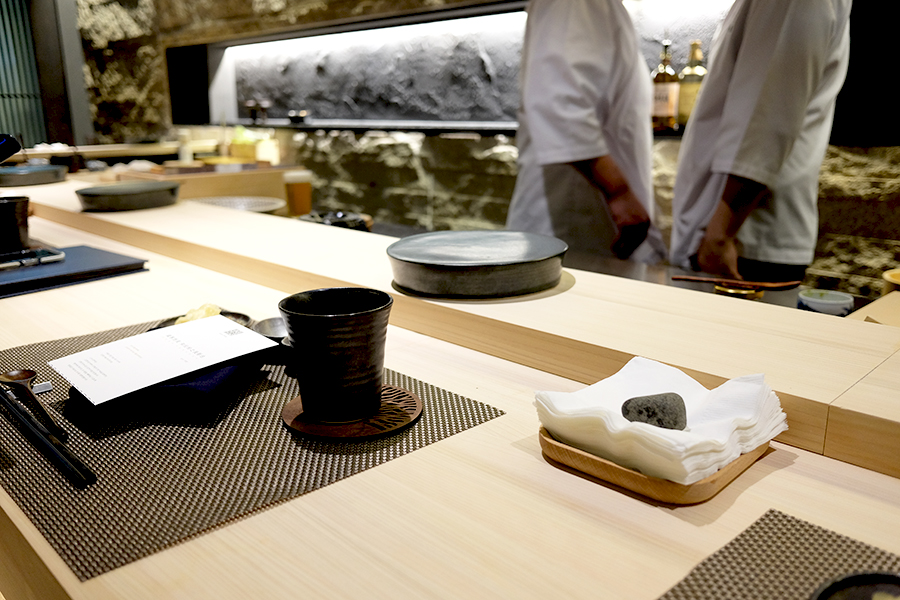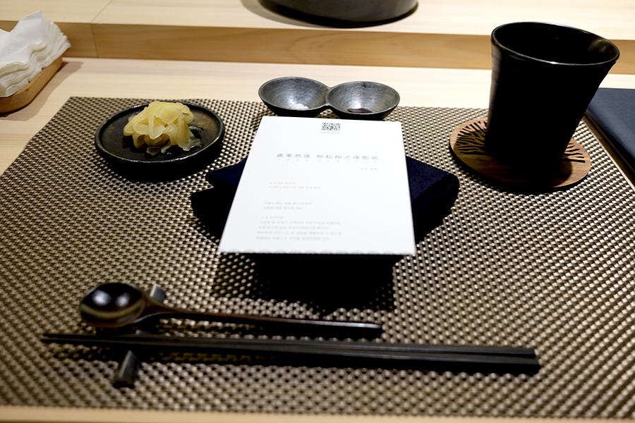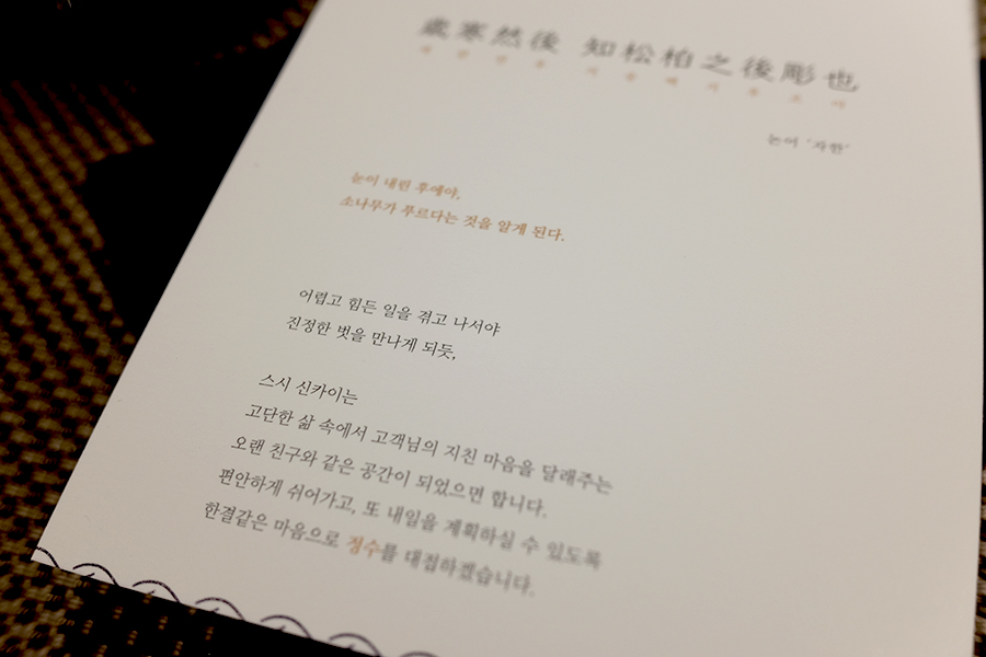 자리에 앉으니 스시 신카이 모토가 적힌 레터와 함께 따뜻한 녹차를 내어주셨습니다.