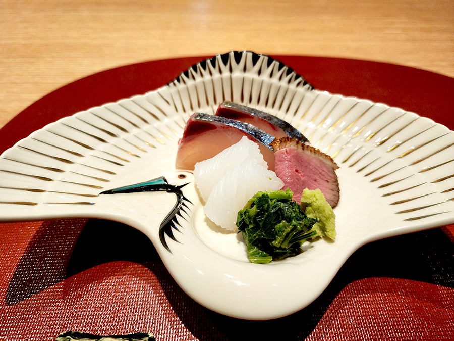 사시미가 올라왔습니다. 시마아지는 약간의 기름짐이 있어서 부드럽고 진한 맛이 느껴졌습니다. 그리고 제가 좋아하는 아오리이까가 나왔네요. 예상했던대로 정말 달달하고 쫀득한 질감이 인상적이었습니다. 오징어 특유의 신선함과 함께 부드러운 식감이 입맛을 사로잡았습니다. 옆에 나온 나물은 방풍나물인데 신선하고 식감이 좋아서 같이 먹으니 음식의 균형을 잡아주더구요.