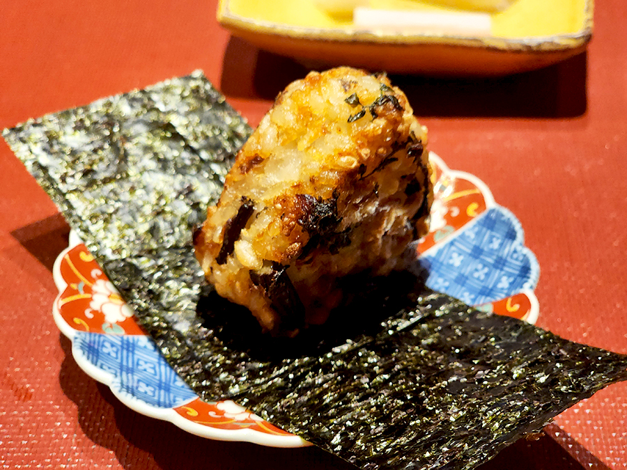 그리고 남은 것은 오니기리로 포장해서 집에 가져갈 수 있게 주시거나 아니면 현장에서 바로 먹을 수 있습니다. 저는 집에 가져가는 것을 선택했는데 셰프님께서 작게라도 맛을 볼 수 있게 해주셨습니다. 오니기리 모양으로 만들어서 이렇게 구워서 스시노리와 함께 주시던데 정말 고소하더군요.