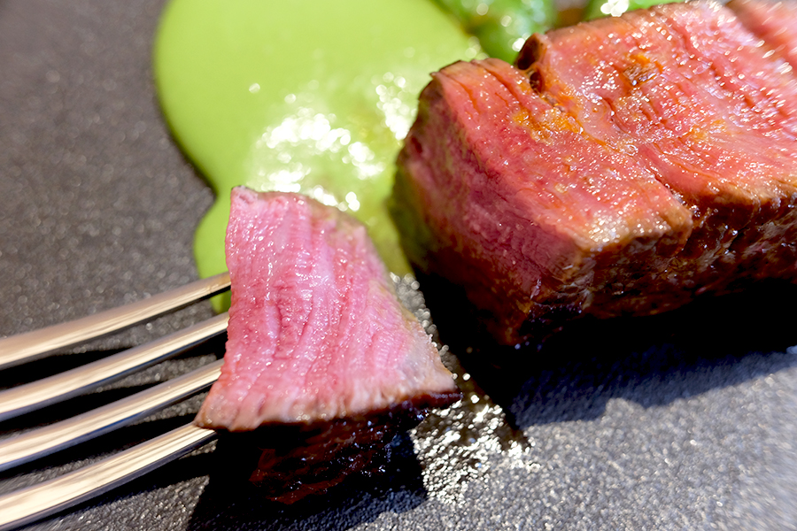 메인으로 한우 안심 스테이크가 나왔고 함께 곁들여 먹을 가니쉬로는 구운 꽈리고추가 나왔습니다. 녹색 소스는 그린 가디스와 큐컴버를 섞은 소스인데 스테이크를 찍어 먹으면 굉장히 상큼하면서 프레쉬한 느낌이었습니다. 가운데 진한 소스는 바베큐 소스라고 설명해 주셨습니다.