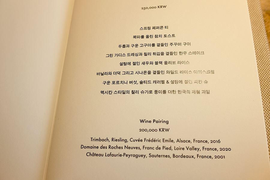 이코이 루이비통 메뉴판 앞에는 셰프님의 GREETING 메시지가 담겨 있고요.