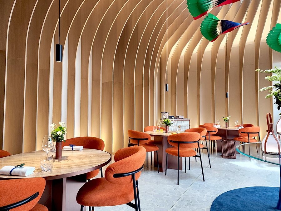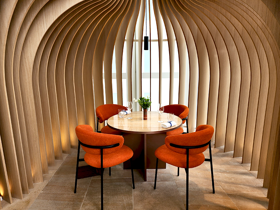 라운드로 된 벽 월과 테이블, 의자의 곡선이 매우 조화롭게 예뻤습니다. 런치가 아니라도 테이스팅 코스로 가볍게 먹으러 와도 너무 즐거울 것 같습니다.