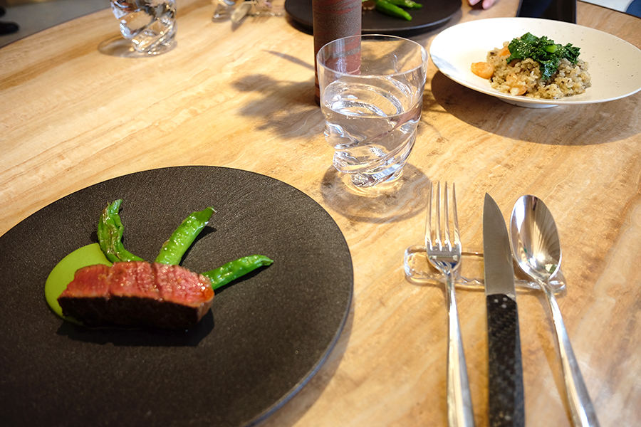 그린 가디스 드레싱과 칠리 튀김을 곁들인 한우 스테이크. 커트러리는 곡선이 아닌 직선면으로 커팅해야 한다고 알려주셨는데 되게 특이하더라고요.