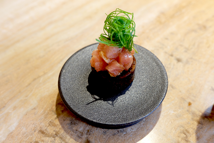 쪽파를 올린 참치 뱃살 토스트.